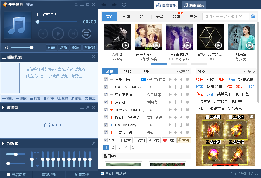 千千静听播放器是一款优秀的国产音乐播放器,具备出色的播放品质、丰富的音乐资源、多变的界面皮肤、深厚的用户基础。全新精美皮肤,清晰专辑大图,华丽动态界面,给你一个全新的视觉体验!在线音乐窗全面升级,接入百度音乐海量曲库,百万高品质歌曲免费下载,千千静听是国内用户数最大的音乐资源共享互助平台。为大家提供了音乐、电影、明星等全方位娱乐资讯,最新最全的mp3歌曲搜索试听…