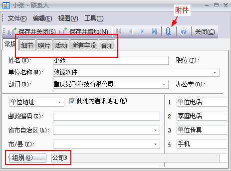 输入一个联系人后,您可以单击“文件”菜单上的“保存并增加同单位联系人”命令(快捷键:Ctrl+M)。后续联系人的单位相关信息(如单位地址、电话等)就不用重新输入了。