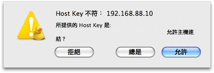 5、在mac电脑里打开cyberduck程序,选择SFTP方式,把刚才查看的IP地址输入到sever一栏里。用户名和密码分别为root及alpine。联接。最初会弹出一个对话框,要求确认是否以所提供的hot key连接,选择总是允许,以后再连接时就不会出现该对话框。然后你就会发现可以浏览IP或IT的文件目录。cyberduck还允许你设定权限。