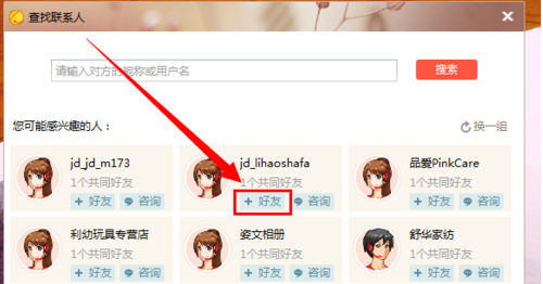 4、弹出查找联系人窗口,你可以输入对方昵称或者用户名进行查找