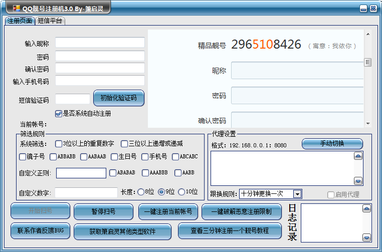 箫启灵QQ靓号注册机3.0版本震撼来袭,此版在1.0和2.0版本基础上添加了短信平台、自定义正则、绕过腾讯恶意注册限制以及手机QQ登录激活等多项全新功能。修复了部分的bug。