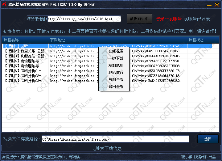 腾讯精品课是一款在线网络学习平台,拥有来自各行各业不同学科的课程。本工具是专门用来解析腾讯精品课视频下载地址,支持全站视频解析(包括收费视频),让你能够免费下载腾讯精品课任意视频。