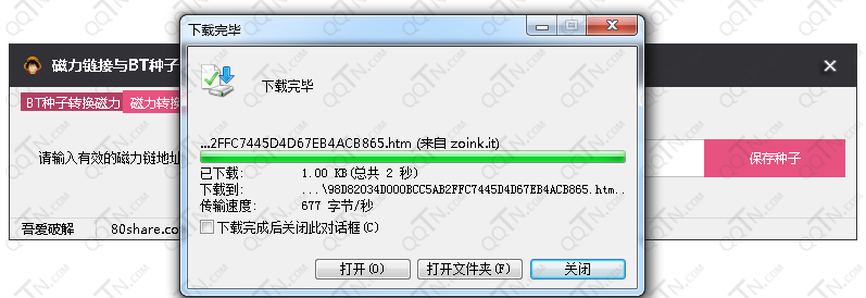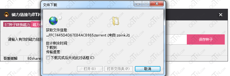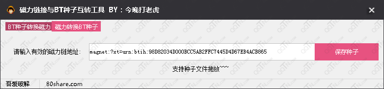 4、如果需要将磁力链接转换成BT种子文件,选择磁力转换BT种子按钮,输入有效的磁力链接,点击保存种子