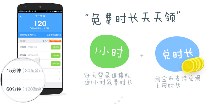 免费时长用完网络会自动断开连接,如还需上网,可先用淘金币兑换上网时长,30淘金币可以兑换15分钟;后期我们会上线更多活动,让您轻轻松松获得更多的上网时长。