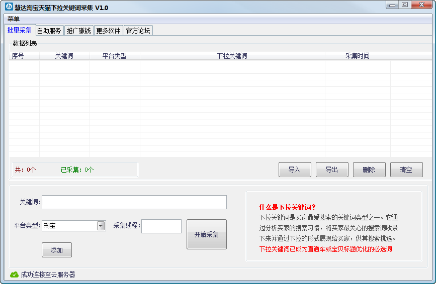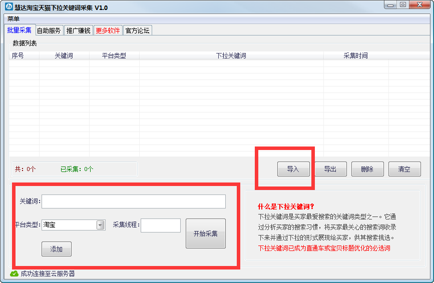 慧达淘宝天猫下拉关键词采集工具可以完整采集到宝贝相关所有最新下拉关键词。支持淘宝和天猫搜索框,采集到的关键词可以作为宝贝标题优化重要依据,支持多关键词和自定义关键词采集。