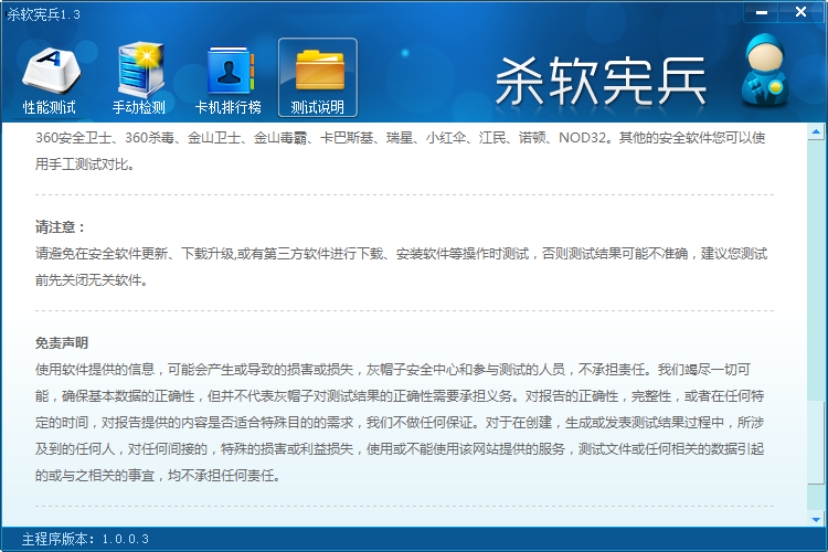 杀软宪兵是一款第三方杀毒软件评测工具,用于对杀毒软件拖慢电脑进行公开、中立的评测,力图以最简单的方式给大家在选择最适合自己的杀毒软件。目前有70%以上的用户都在抱怨自己的电脑慢、电脑卡,而这其中有很大一部分就是杀毒软件造成的,杀毒软件已经成为拖慢系统资源的罪魁祸首。
