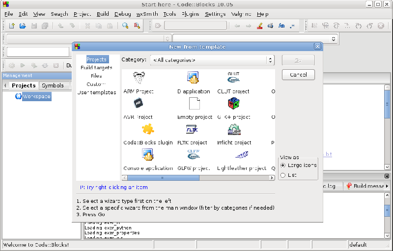 2、提供多个工程模板,包括控制台应用、DirectX应用、动态连接库、FLTK应用、GLFW应用、Irrlicht工程、OGRE应用、OpenGL应用、QT应用、SDCC应用、SDL应用、SmartWin应用、静态库、Win32 GUI应用、wxWidgets应用、wxSmith工程,另外它还支持用户自定义工程模板。