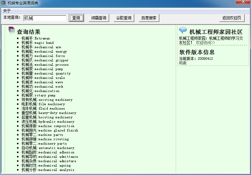 机械专业英语词典是一款专业英语词典翻译软件,主要适用于机械工程专业。拥有数十万条专业机械工程词汇数据库,支持英汉互译查询;软件提供了本地查询、词霸查询、谷歌查询、百度搜索等四种查询方式,以最精准的翻译满足用户的需求。