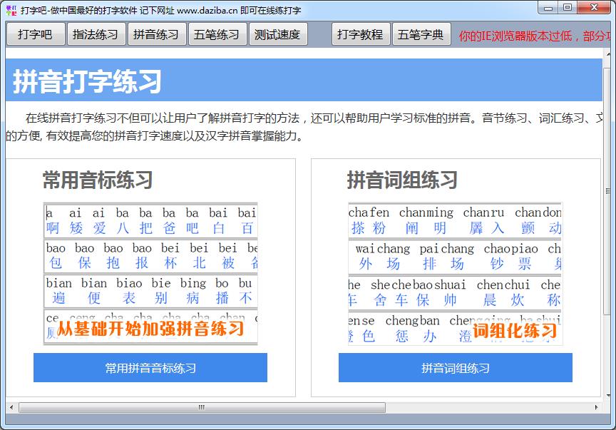 拼音打字练习不但可以让用户了解拼音打字的方法,还可以帮助用户学习标准的拼音。音节练习、词汇练习、文章练习可以给初学汉语或者汉语拼音水平不高的用户提供了极大的方便, 有效提高您的拼音打字速度以及汉字拼音掌握能力。