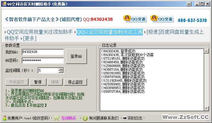 QQ空间访客实时删除助手是智者软件推出的一款空间访客删除工具,它能帮助QQ空间用户实时删除空间访客记录,通过此软件能够直接帮你删除QQ空间最近访客记录,充分保护你的隐私,另外它还支持自定义调节监控速度,实时日志显示,循环不断的进行监控删除,欢迎下载使用。