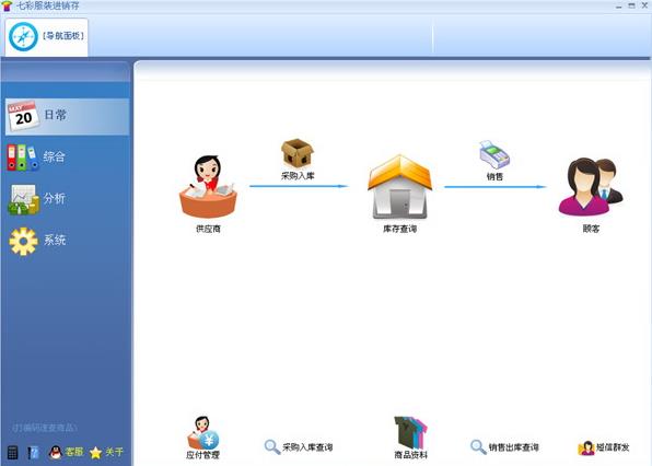 七彩服装进销存软件涵盖进销存 + 收付款 + 费用管理 + 提成 + 盘点 + 会员管理等多种常用功能,另外支持条码标签打印,短信发送,支持服装管理工作中常用到的扫描枪,小票打印机,盘点机等外部设备,是不可多得的一款智能化服装进销存软件。