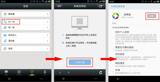 2、 用手机扫描电脑上的二维码下载应用宝完整版。以微信为例:打开微信“扫一扫”扫描电脑上的二维码成功后点击“立即安装”即可下载应用宝完整版到手机上安装。