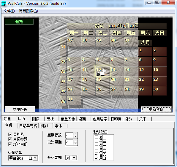 WallCal3是老牌的桌面日历软件,不仅可以自动定时更新桌面壁纸,还可设置桌面上的图标文字背景颜色,并且无缝合成于桌面上,你可以在日历上及时记事,方便安排学习和工作计划。