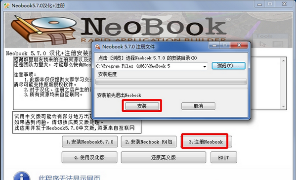 按照1-2-3的顺序来安装NeoBook,如果要使用汉化版,可以在NeoBook安装后,点击“使用汉化版”,