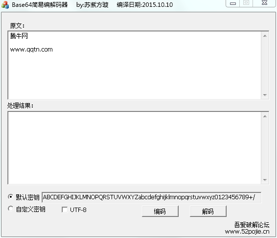 Base64简易编解码器支持默认密钥和自定义密钥,软件提供了Base64编码和Base64解码功能,支持UTF-8,由吾爱破解论坛出品。