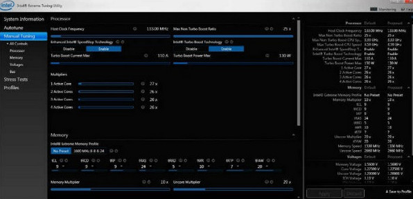 Intel Extreme Tuning Utility中文版能够对处理器、内存和系统时钟进行精确调整,并监控温度、电压和风扇速度。是英特尔的唯一一款官方超频工具。
