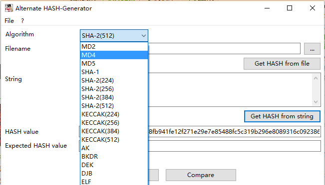 哈希生成器 HASH-Generator 可以生成一个文本或文件的散列值(校验和)。它是开放源码(MSVC ++2005)。支持多种算法,包括MD2、MD4、MD5、SHA-1、SHA-2(224,256,384,512)、KECCAK/ SHA-3(224,256,384,512)