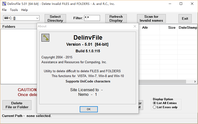 DelinvFile是一个实用程序,您可以用它来删除您一直无法使用正常的Windows删除功能删除数据文件。DelinvFile是旨在帮助您从计算机中删除无效的文件和文件夹,在那里他们可以不通过专门的工具来回收点的程序。