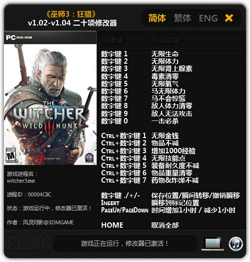 巫师3狂猎修改器是由3DM风灵月影专门针对《巫师3:狂猎》制作的多功能游戏修改器,这款修改器支持无线生命、无限体力、无限肾上腺素、无限氧气、无限金钱、一击必杀、无限技能点等多达20项修改功能,喜欢玩巫师3:狂猎的玩家千万不要错过风灵月影大大的这款修改器哦!