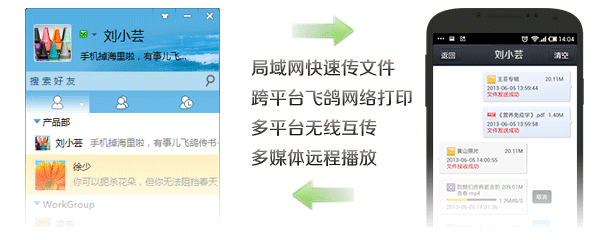 快捷方便是软件的最大特点,自动扫描在线飞鸽用户,无需安装和配置各类打印机驱动程序,即刻实现客户端文件互传、远程播放和打印功能,成为企业、政府办公和家庭多媒体共享的有力工具,而且基于内网,安全、可控。